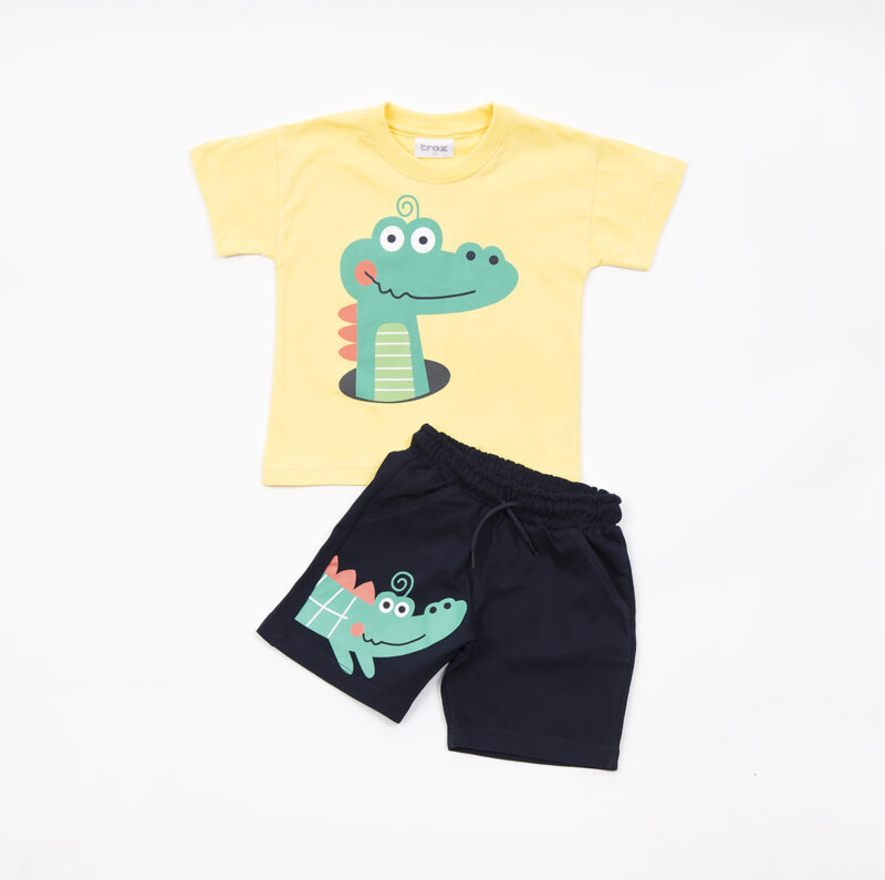 Σετ μακό με τύπωμα κροκόδειλο στη μπλούζα και στη βερμούδα, της εταιρίας TRAX.