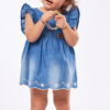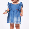 Τζιν φόρεμα αμάνικο με βολάν στους ώμους, λουλούδια κεντημένα στο κάτω μέρος και κουμπιά, της εταιρίας ΕΒΙΤΑ.