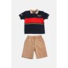 Σετ μπλούζα κοντομάνικη πικέ δίχρωμη με γιακά σε μπλε, με τύπωμα μπροστά και στο μανίκι σε μπλε-κόκκινο σε συνδυασμό με βερμούδα ύφασμά σταθερό με λάστιχο στη μέση και διακοσμητικές τσέπες και γαζιά σε μπεζ της εταιρίας JOYCE.